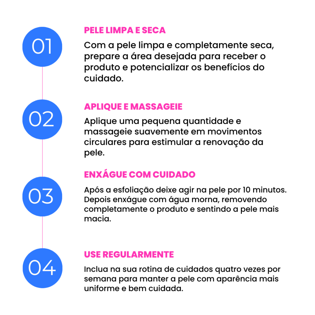 O esfoliante pode ser utilizado em diversas áreas como axilas, virilhas, regiões íntimas, joelhos, cotovelos e outras regiões que você deseja cuidar.